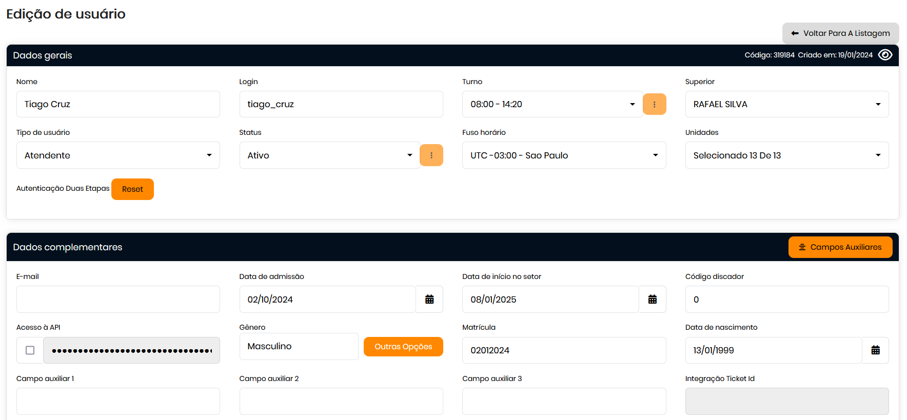 - Dados gerais do usuário , como nome, tipo de usuário, dados de admissão, turno e fuso horário.