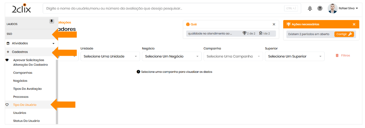 É necessário ter a permissão "Histórico dos Avaliados" deve estar ativa em: SSO > Cadastros > Tipo de Usuário.