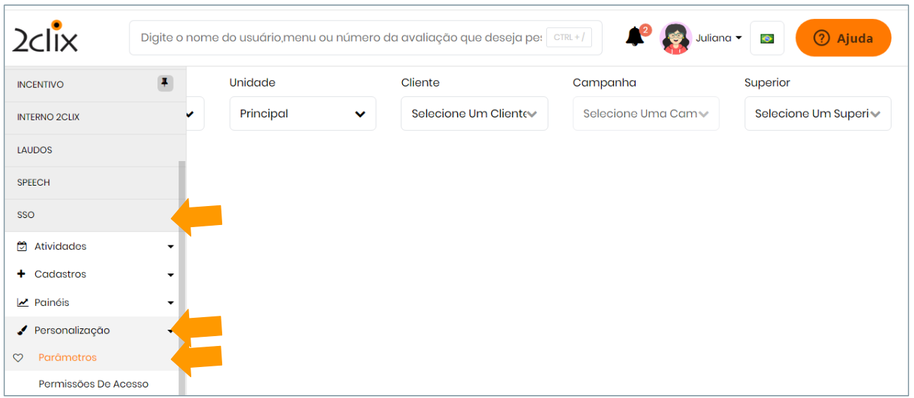 💡Passo a passo1°: No menu lateral esquerdo, acesse: SSO> Personalização> Parametros