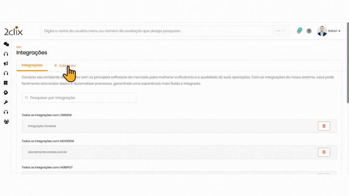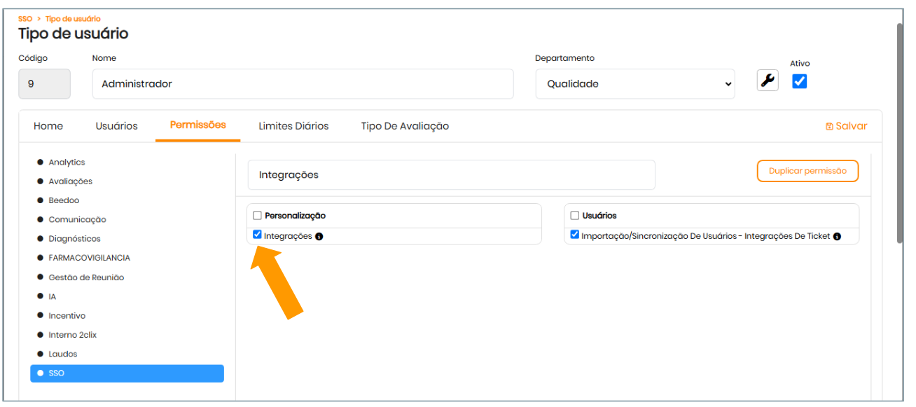 Acesse a área de Integrações na 2CLIX: No menu lateral da 2CLIX, clique em SSO>Personalização> Integrações.