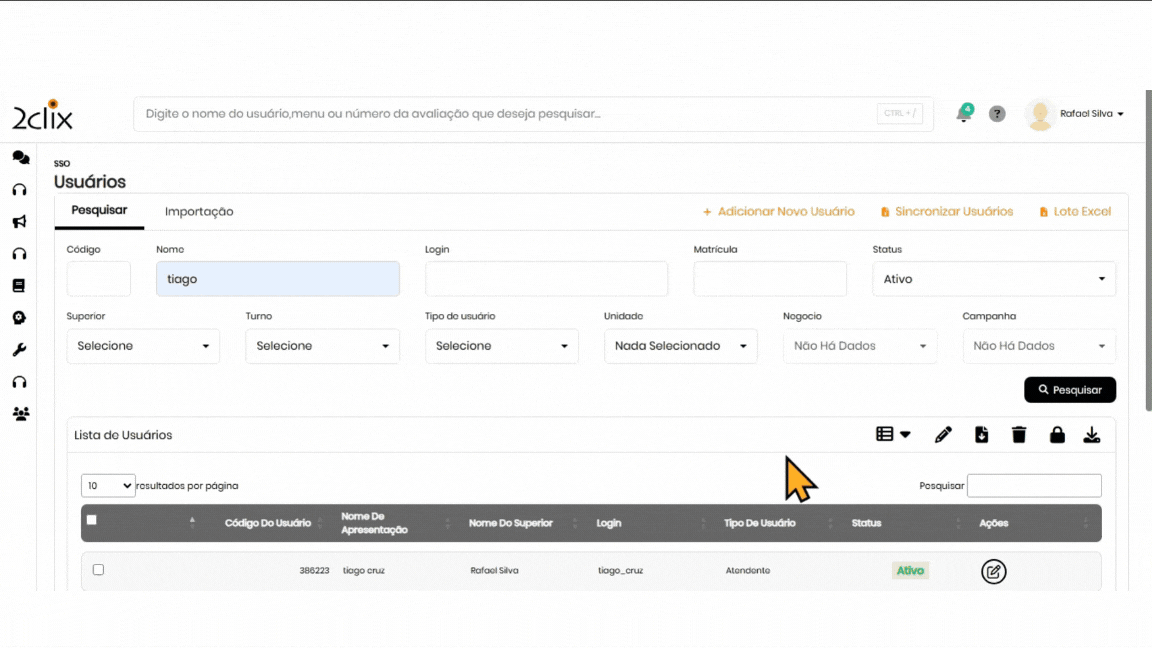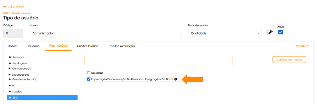 Em modo de edição em SSO>Cadastro>Usuários, configure a usuário a integração: