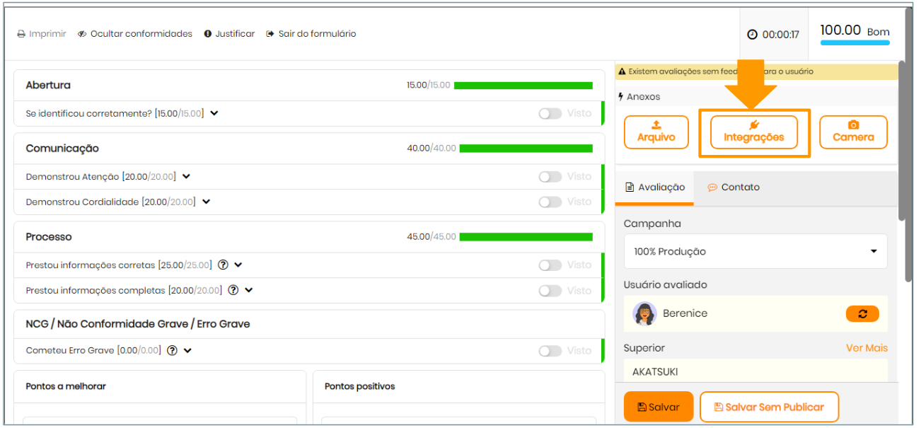 Após a integração estar configurada, ao iniciar uma avaliação, você poderá anexar tickets diretamente no formulário.