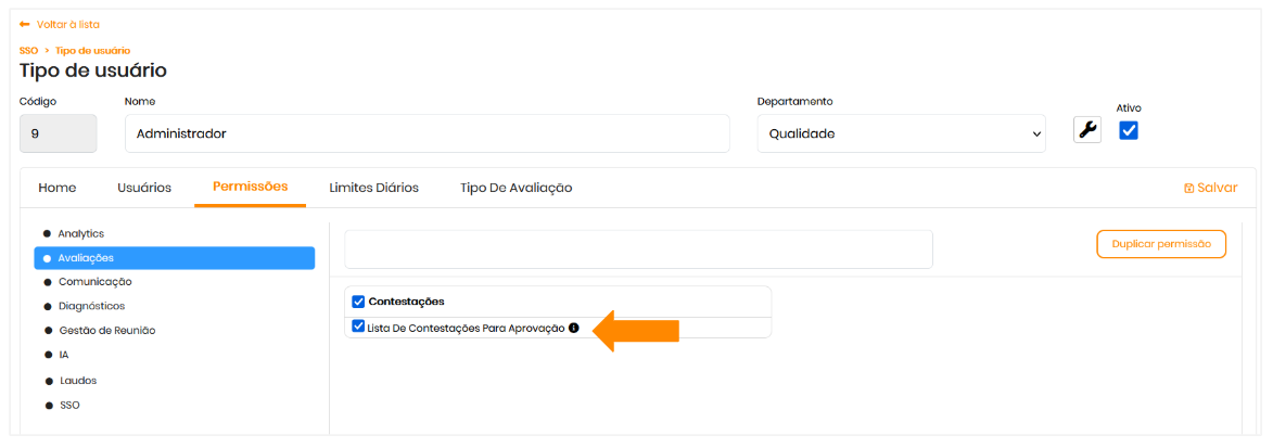 - Monitoria de Outros Departamentos: Caso a contestação esteja vinculada a outro departamento, o usuário precisa ter a permissão para visualizar monitorias de outros departamentos.
