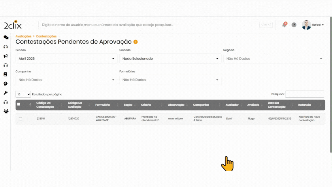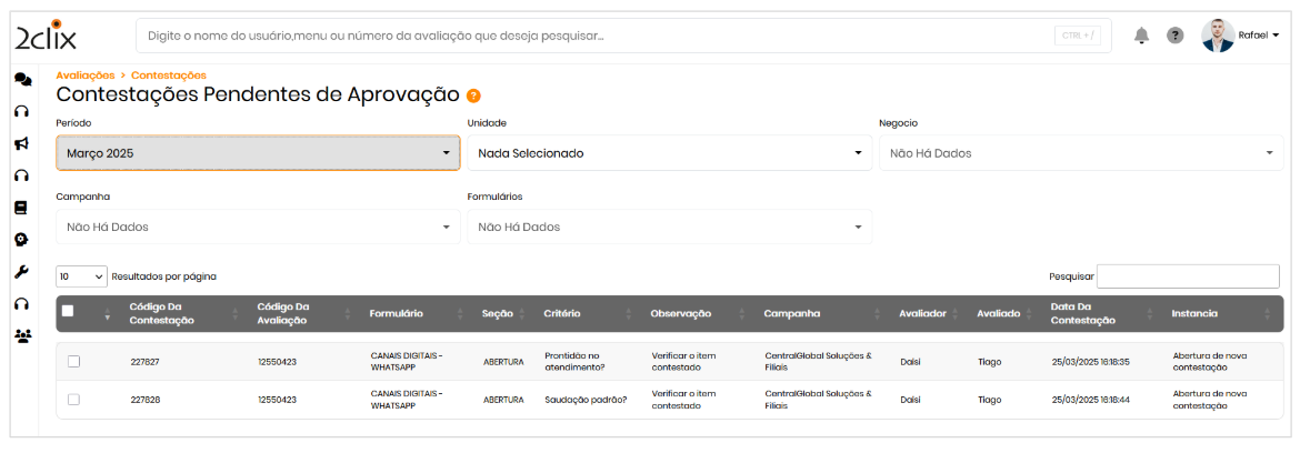 - Campanha: Nome da campanha à qual a avaliação e contestação estão vinculadas.