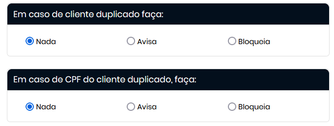 Clientes e CPFs Duplicados : Configure o comportamento da plataforma em casos de duplicidade, definindo se ela deve bloquear , alertar ou permitir o cadastro de clientes ou CPFs já existentes na plataforma. (🔎 Saiba mais em: Em caso de Cliente Duplicado e/ou CPF Duplicado).