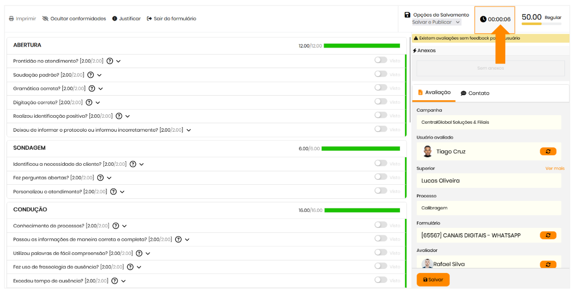 O cronômetro estará visível na tela do avaliador, registrando o tempo decorrido desde o início até a finalização da avaliação.