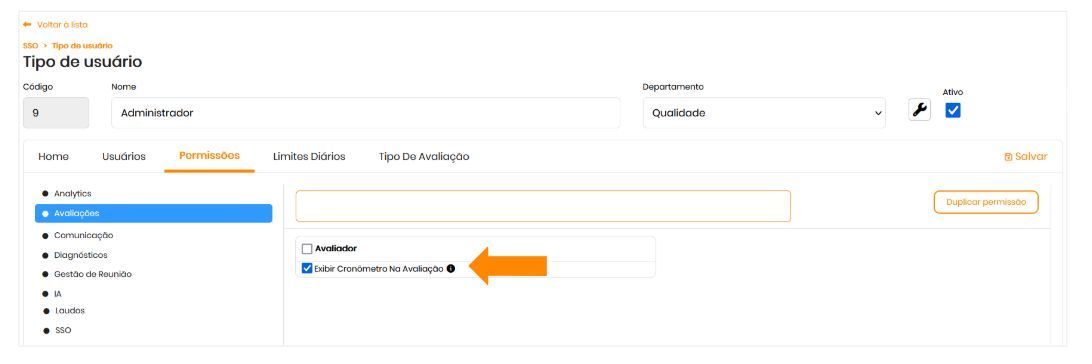 Para acessar essa funcionalidade, é necessário que o usuário tenha a permissão "Exibir cronômetro na avaliação" habilitada em seu perfil.