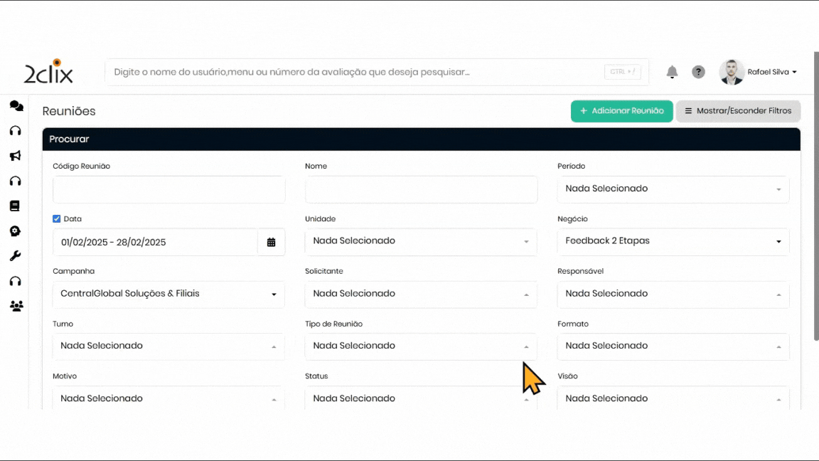 Localize a Reunião: Use os filtros para encontrar a reunião desejada. Visualize em tela ou extraia em Excel.