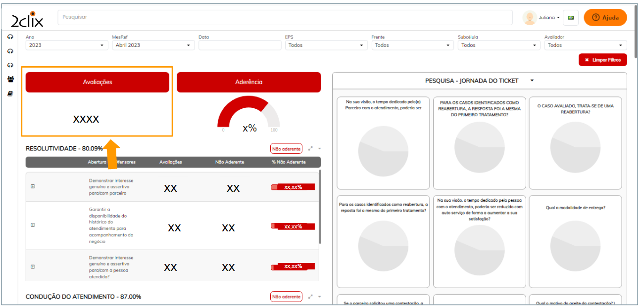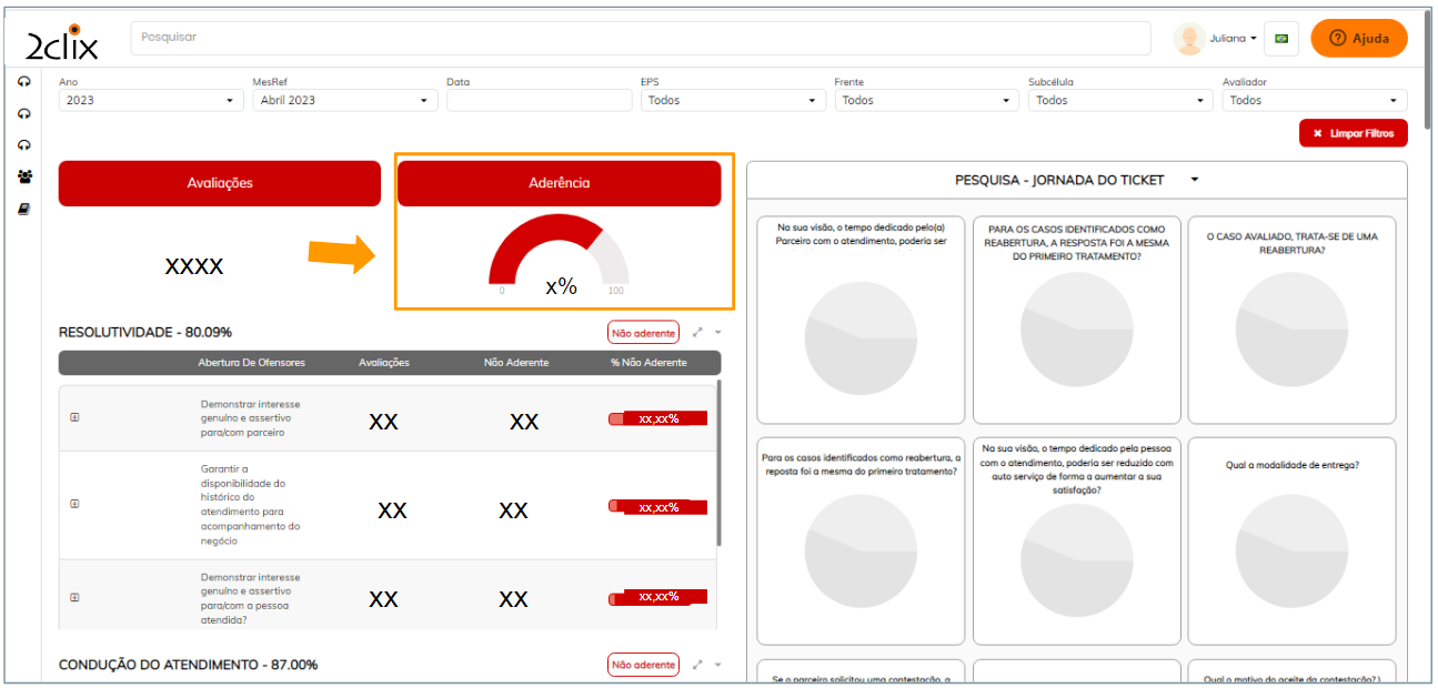 O Painel de Aderência é uma ferramenta que permite acompanhar as avaliações realizadas. Diferentemente da média de notas , que considera todas as atribuídas, a aderência calcula o percentual de avaliações que recebeu nota 100 dentro de um determinado período.