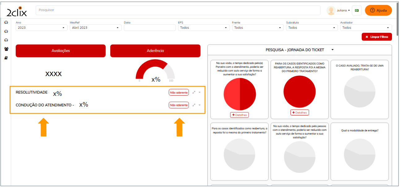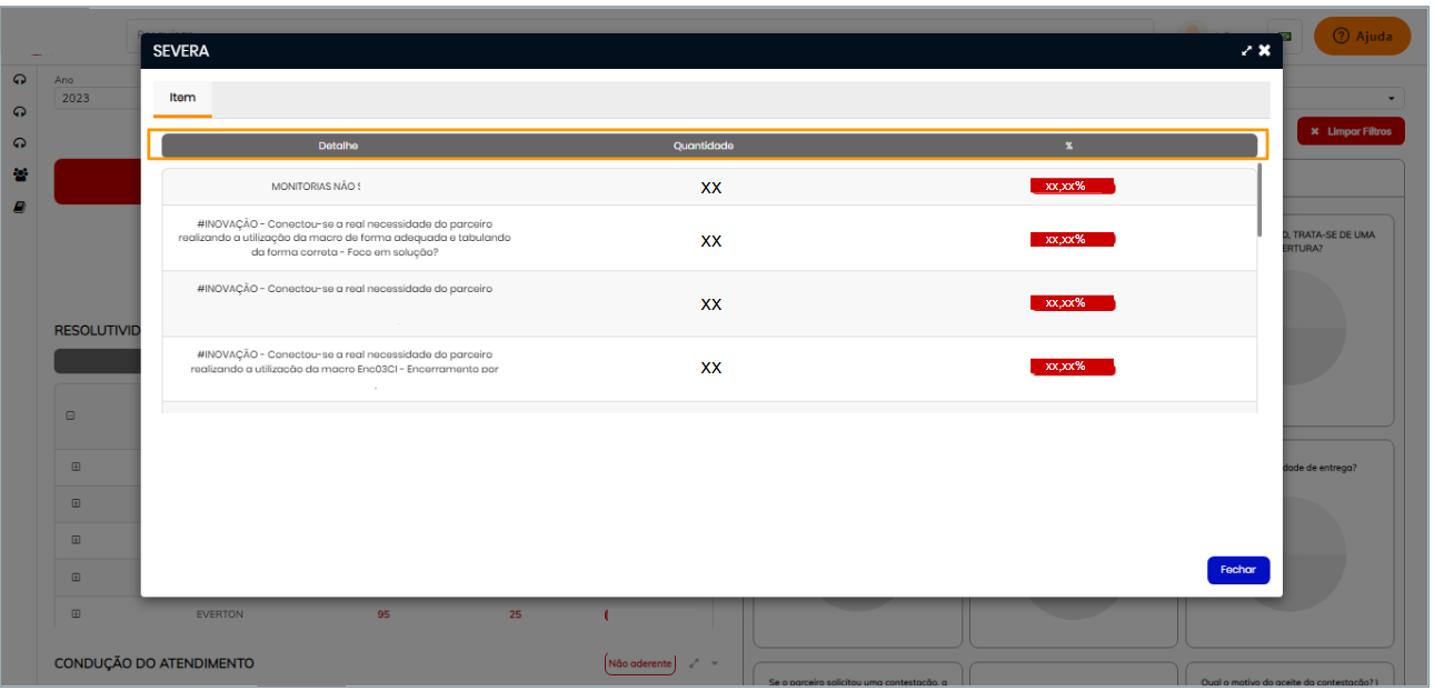 - Ao clicar nos indicadores "Resolutividade" ou "Condução do Atendimento", é possível visualizar os itens que impactaram os níveis de desempenho .