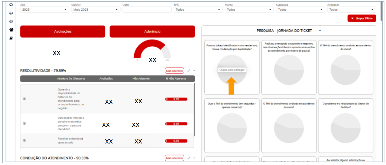 - Ao clicar em um gráfico, será exibido o percentual de aderência e inaderência dos itens avaliados.