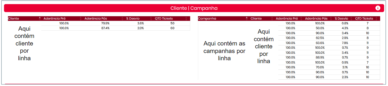 Apresenta os resultados consolidados por cliente, com abertura por campanha. Inclui métricas como: