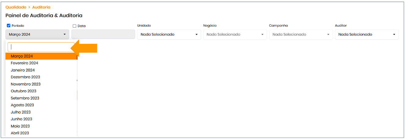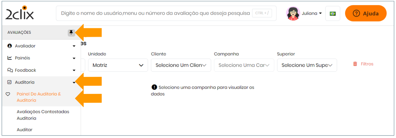 Pelo menu lateral esquerdo, seguindo o caminho: Avaliações > Auditoria > Painel de Auditoria & Auditoria