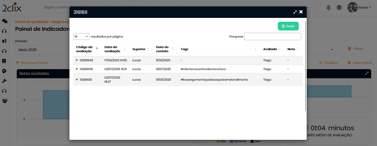 - Gráficos e cards são clicáveis, exibem dados detalhados e oferecem opção de exportação para Excel. Também direcionam para a avaliação associada.