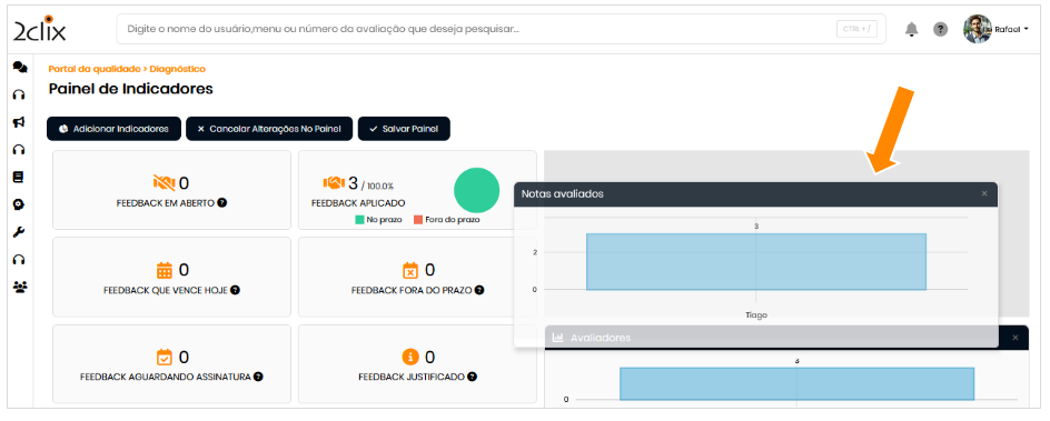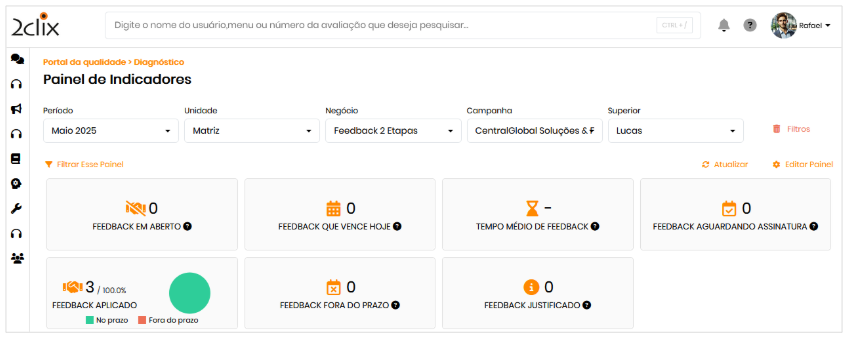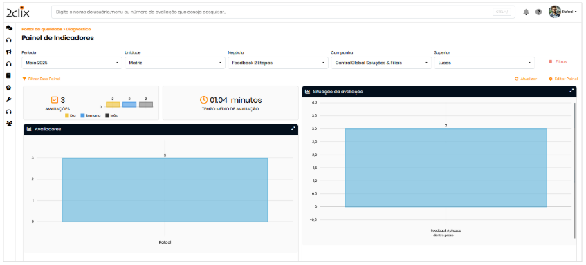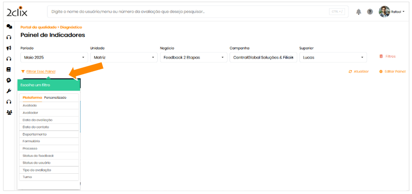 - Refinar com filtros secundários: selecione itens como Plataforma, Avaliado, Avaliador, Departamento, Formulário, Status do feedback, Turno etc.