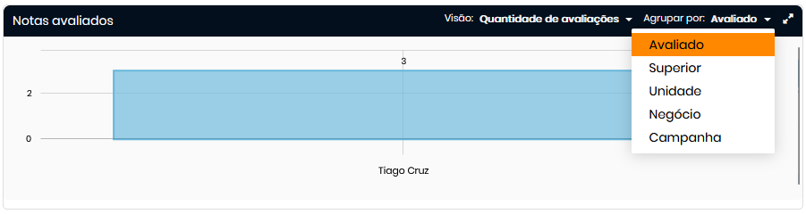 - Notas avaliadas: exibe o volume de avaliações realizadas por colaborador. Permite alterar a visão de agrupamento por Avaliado, Superior, Unidade, Negócio ou Campanha.