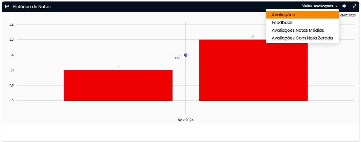- Histórico de notas: evolução mensal das notas; gráfico com filtro de visão e dados atualizados com base no dia anterior.