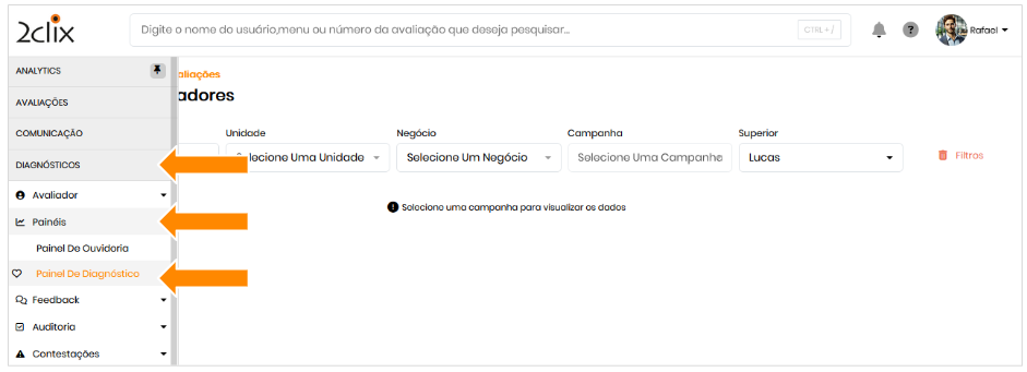 - Menu: Diagnóstico> Painéis >Painel de Diagnóstico ;