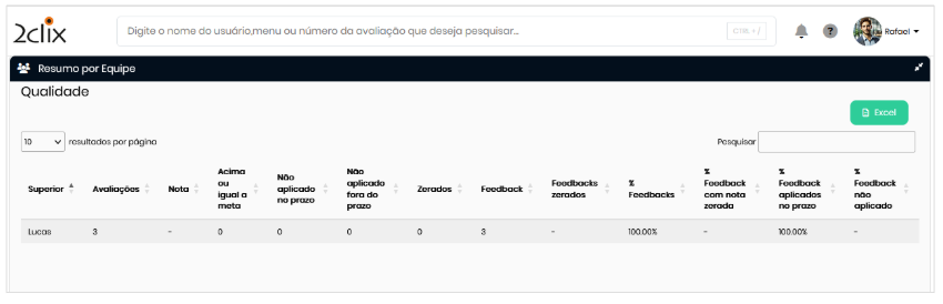 - Resumo por equipe: volume, nota, metas e status de feedbacks. Ao clicar em uma linha, é exibido um modal com a relação de avaliações. O clique em uma avaliação dentro do modal direciona para o formulário avaliado. Os dados podem ser exportados em Excel.