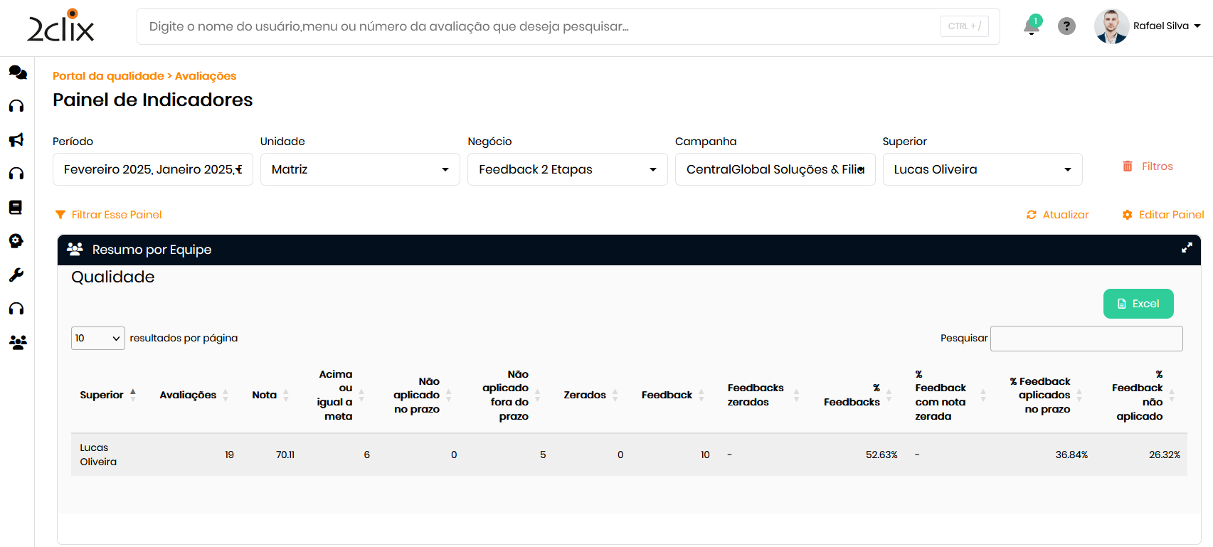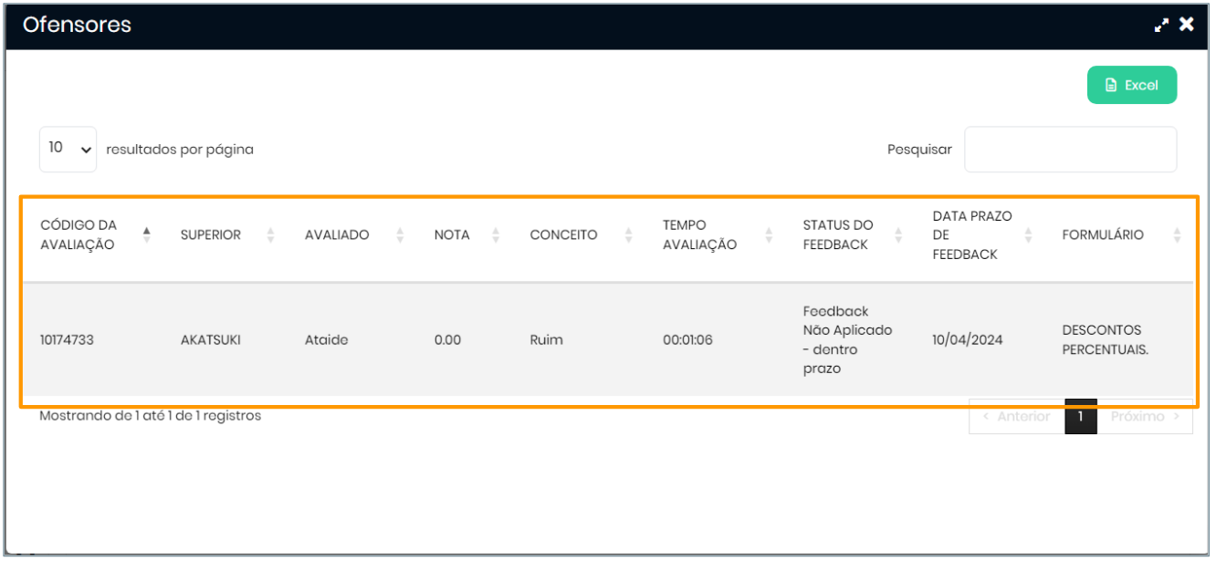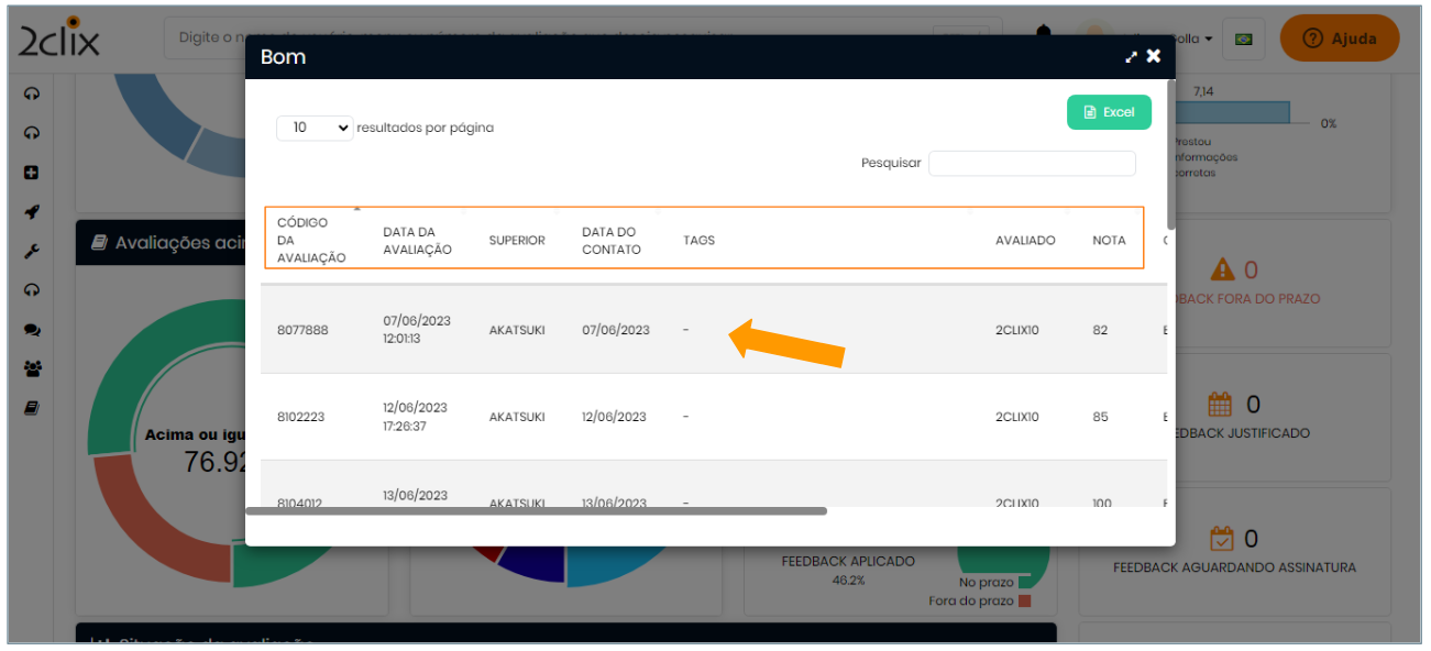 Ao clicar sobre as AVALIAÇÕES, é possível ver uma lista em tabela, com os principais detalhes, e esses podem ser exportados também em Excel. O clique sobre a linha abre a avaliação. 🔎Para maiores informações, clique aqui: Card de Avaliações;