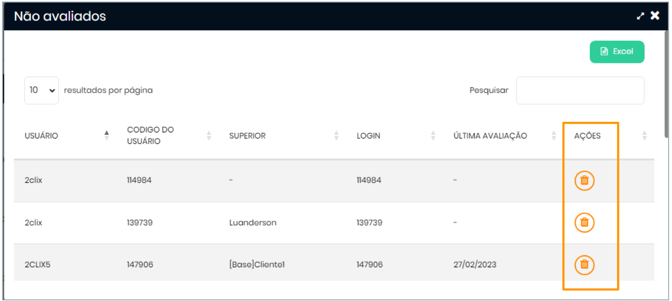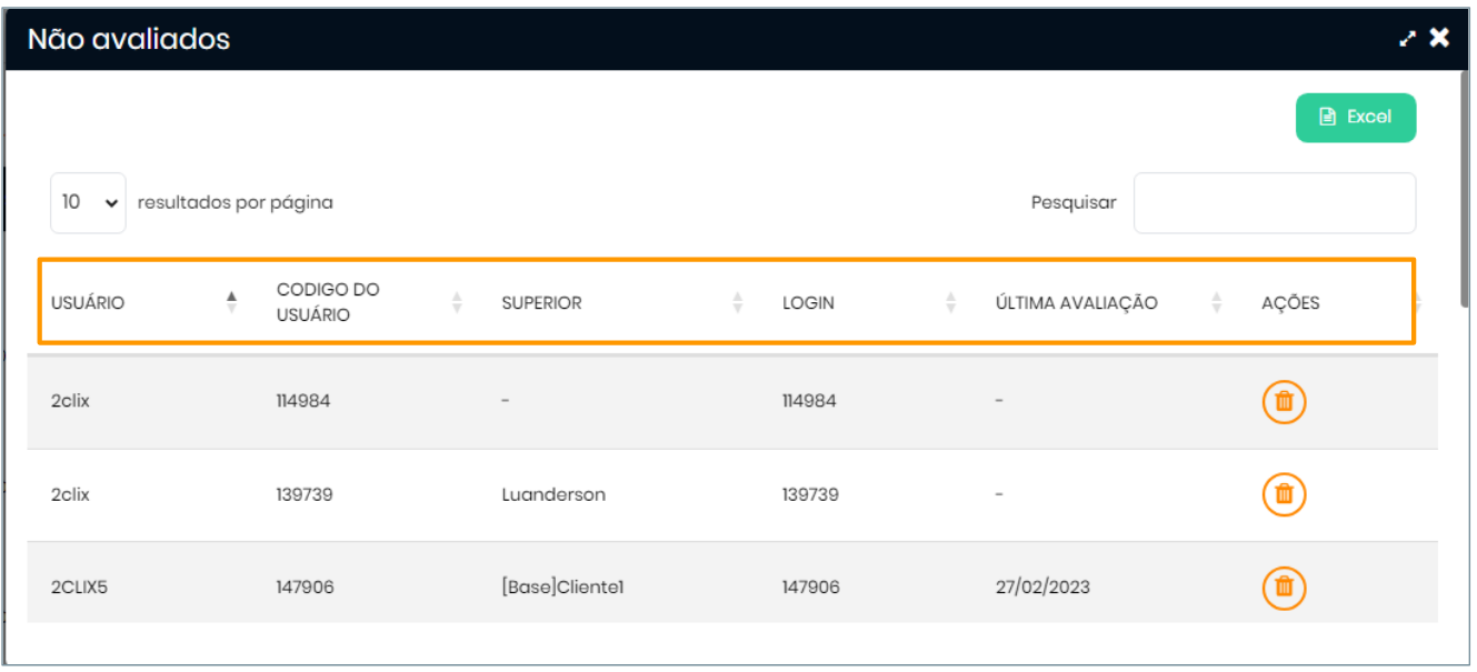), abrirá uma tela com os nome dos usuários, código do usuário, superior, login e ações (temos a opção de excluir o usuário dos não avaliados, para isso é necesário ter a permissão de acesso):