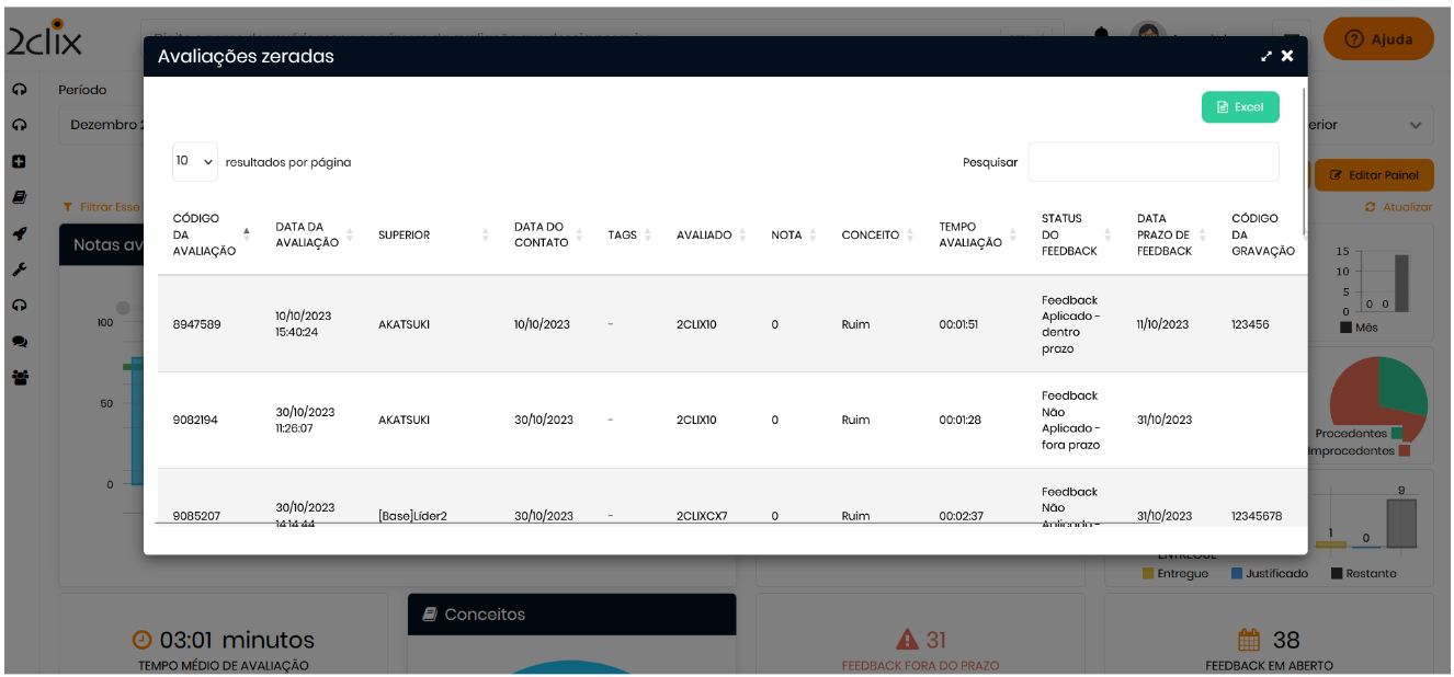 Ao clicar sobre as TEMPO MÉDIO DE AVALIAÇÃO, é possível ver uma lista em tabela, com os principais detalhes, e esses podem ser exportados também em Excel.