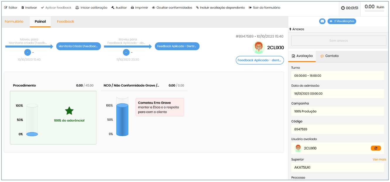 📌Ao clicar no gáfico apresentará informações da avaliação e ao clicar na linha levará até o formulário.