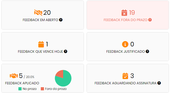 Outras visões disponíveis, também temos os: feedback em aberto, feedbacks fora do prazo, feedbacks que vence hoje, feedback justificado, feedback aplicado, feedbacks aguardando assinatura e tempo médio de feedback: