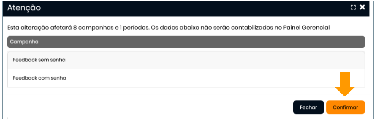 A plataforma exibirá uma tela de confirmação, informando as alterações e quais campanhas serão contabilizadas no Painel de Indicadores. Após clique em confirmar: