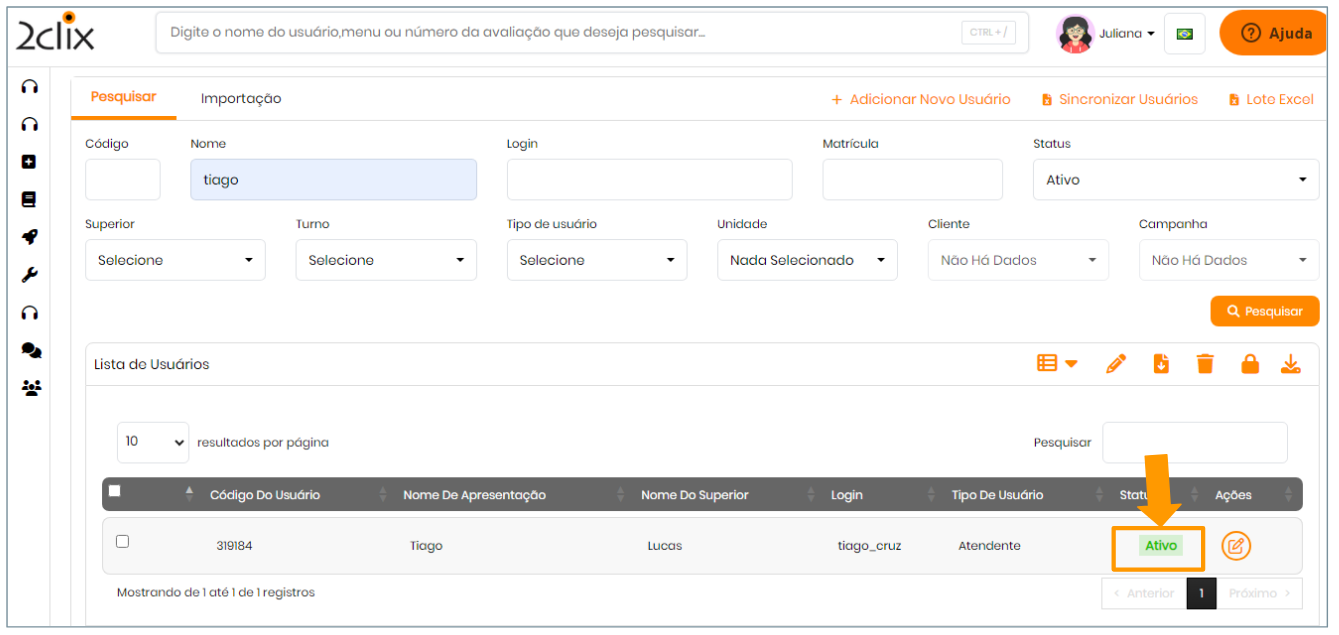 Dentro do cadastro de usuários, basta clicar no status do usuário que deseja inativar.