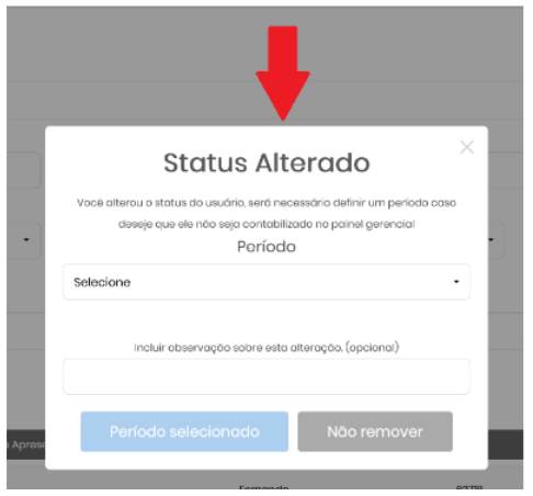 Antes de alterar o status para "Inativo", a plataforma exibirá um pop-up para que o usuário selecione o período desejado, insira observações e escolha se deseja mover os dados a partir do período selecionado ou simplesmente inativar o usuário sem remover do histórico.