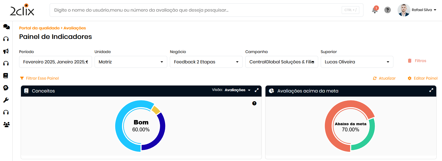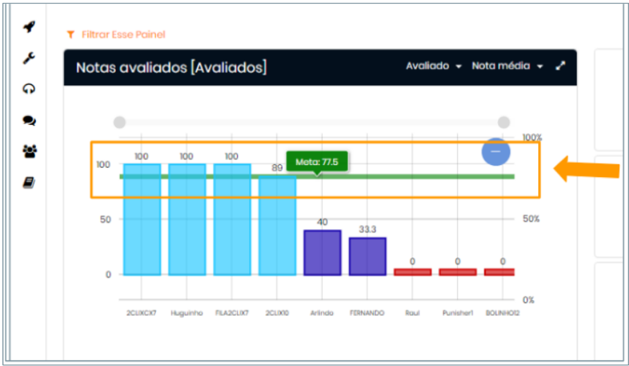 Gráfico de AvaliaçõesNo gráfico de avaliações acima da meta, mostra em percentual as avaliações acima ou igual a meta estipulada e abaixo da meta.