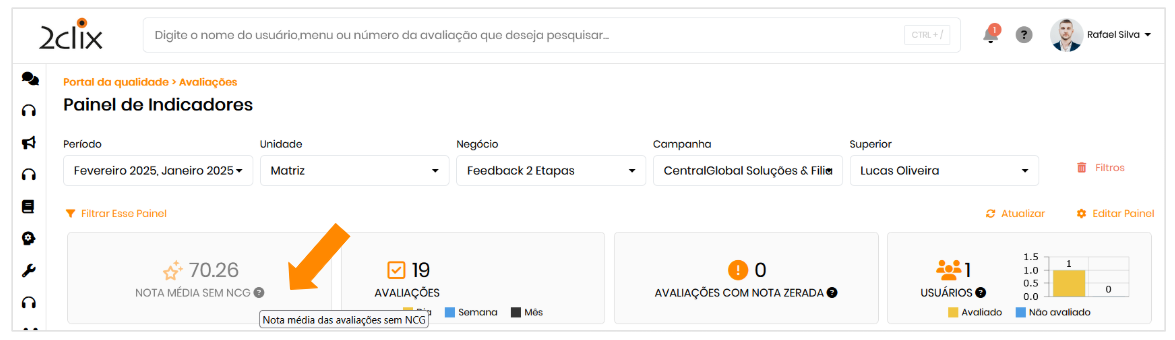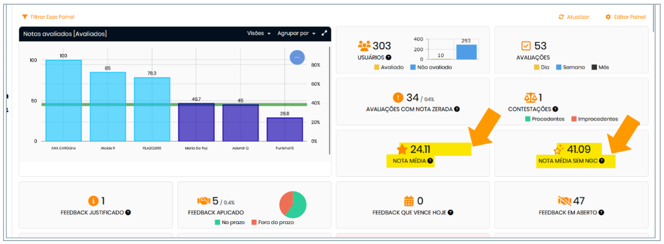- Média de Nota Considerando Avaliações sem Zeros em NCG. Esta métrica oferece uma outra perspectiva do desempenho, mostrando qual seria a média de nota se as avaliações zeradas em NCG (Não Conformidade Grave) não fossem consideradas.