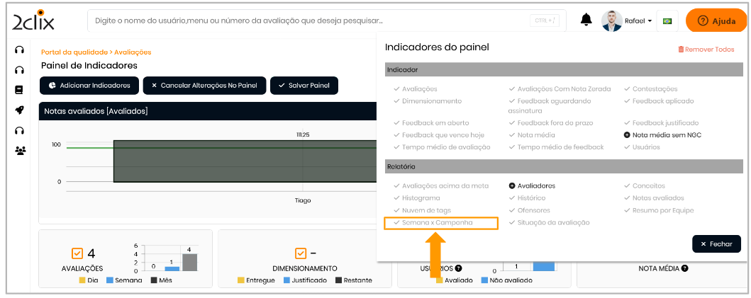 Clique no botão: "Adicionar indicadores", após vá em "relatórios" e procure pela opção "Semana X Campanha" e não esqueça de clicar no botão de "Salvar Painel".