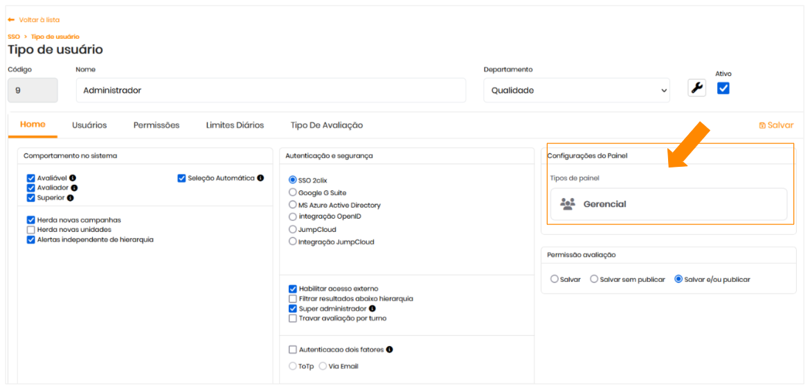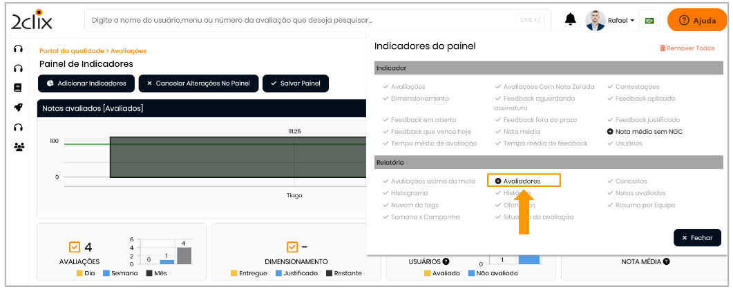 - Clique no botão: "Adicionar indicadores", após vá em "relatório" e procure pela opção "Avaliadores" e não esqueça de clicar no botão de "Salvar Painel".