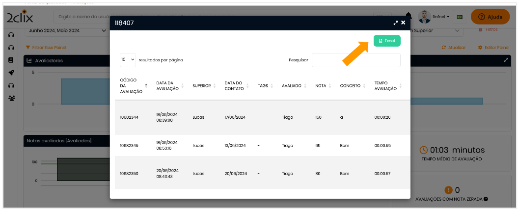 Exportar Dados para Excel: Dentro do modal, haverá a opção de exportar os dados das avaliações para um arquivo Excel.