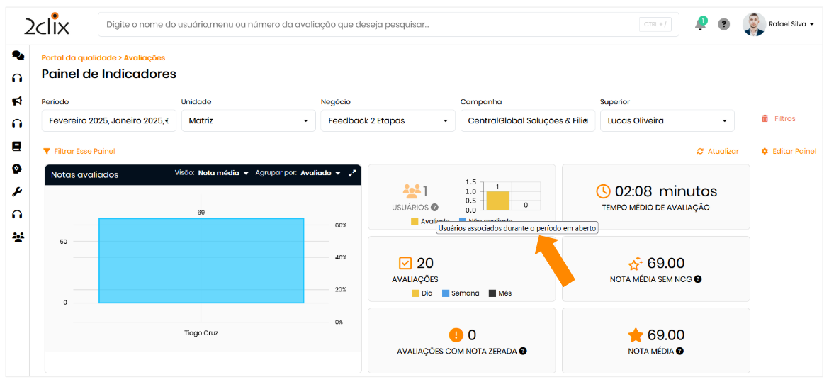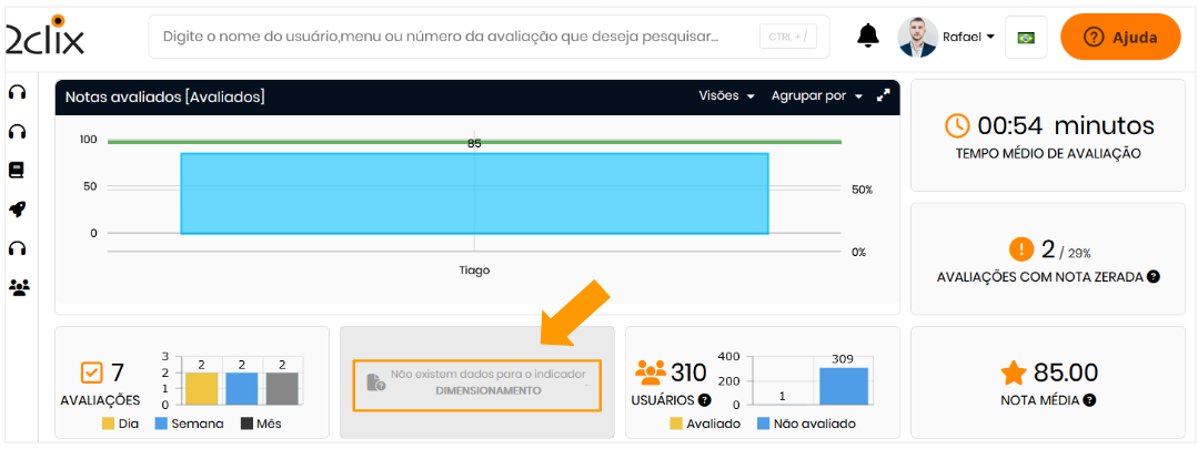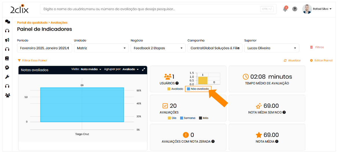 📌Ao clicar sobre USUÁRIOS, a tela se move para exibir o gráfico de nota por usuário avaliado e no card possui mais visões em dois campos: Avaliado e não avaliado, veja o exemplo abaixo.