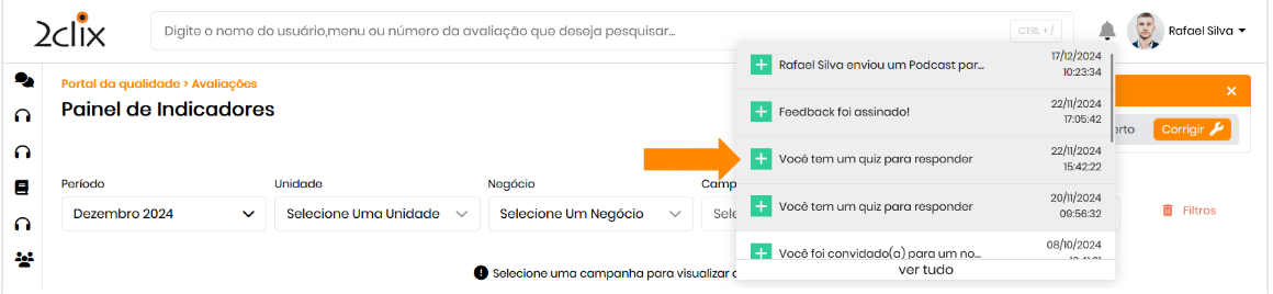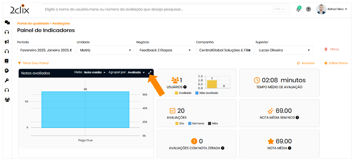 Ao clicar na barra abrirá o relatório com maiores detalhes das avaliações. Também é possível clicar na linha para chegar até a avaliação do usuário.