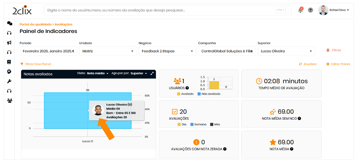 Posicionando o mouse é possível visualizar outros dados como no exemplo abaixo ou ao clicar na barra do gráfico que será direcionado para o histórico do avaliado.