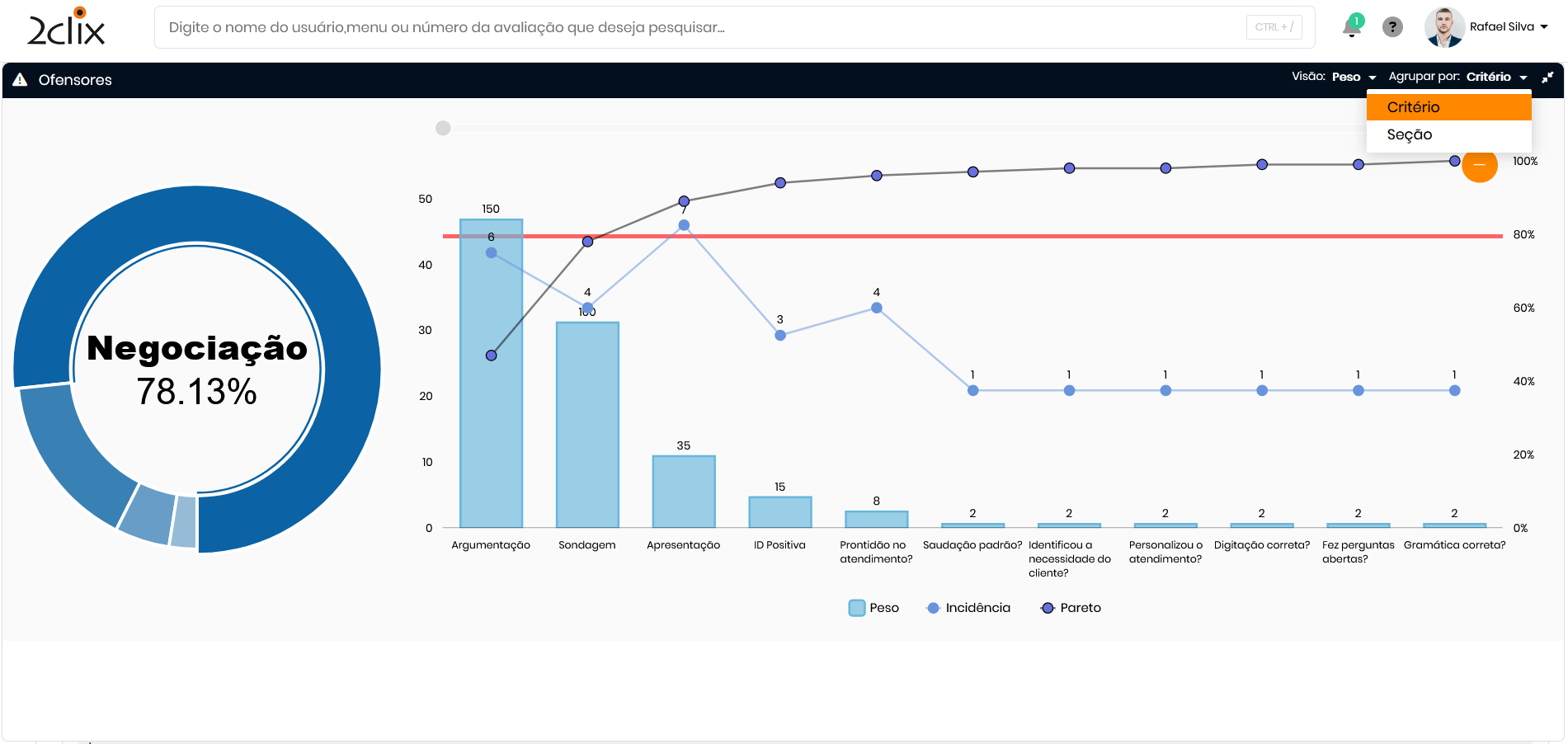 Na lateral direita, temos o diagrama de pareto com o conceito de 80 20. A linha vermelha determina os 80% do eixo secundário e o percentual do eixo principal. A curva do pareto, mostra o percentual de cada item na visão virá o padrão por peso, porém podemos alterar por incidência. Cada barra do gráfico representa um critério de avaliação.