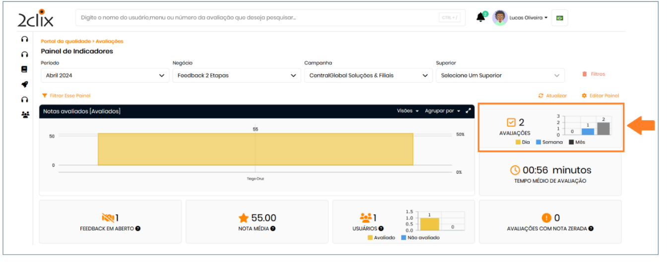 No card de avaliações, você encontrará um gráfico que exibe o volume de avaliações realizadas. Há opções para visualizar os dados por: