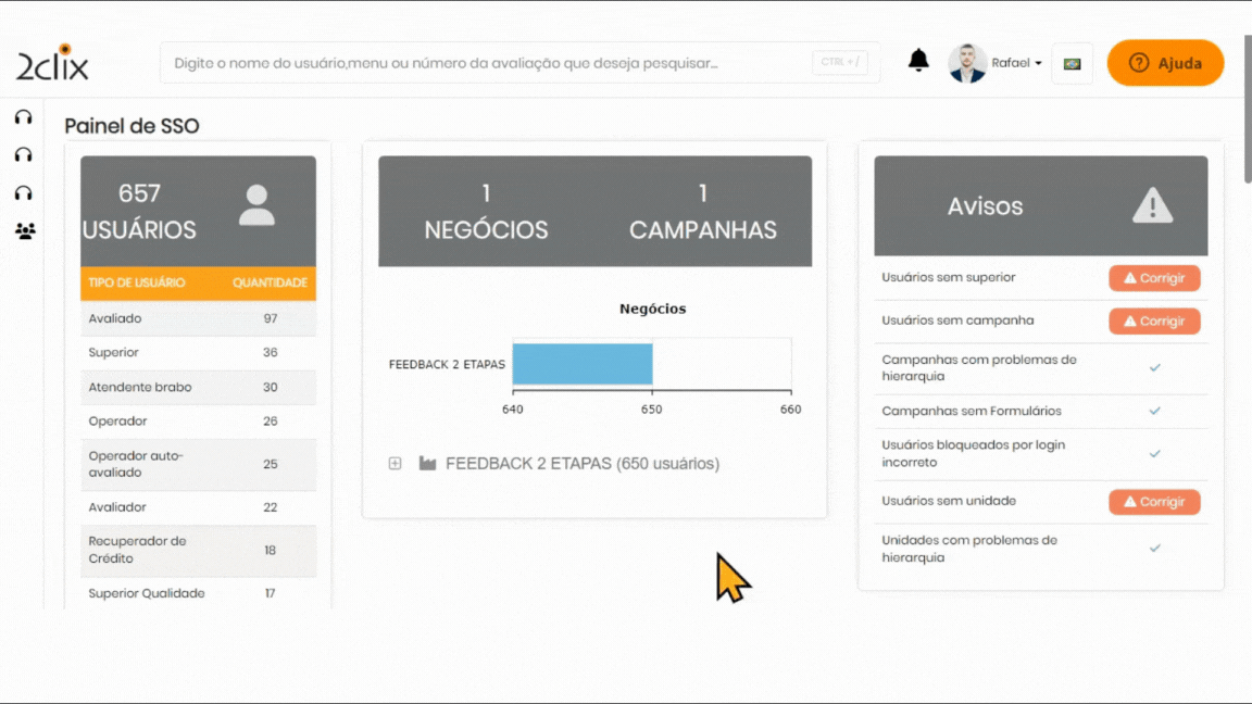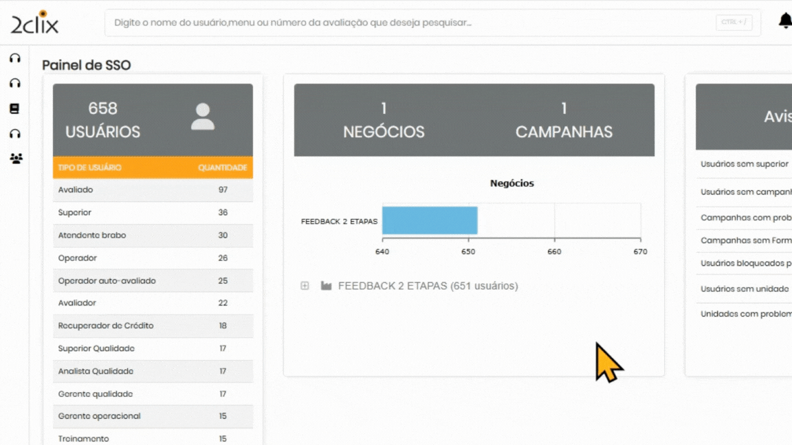O painel do módulo SSO oferece uma visão geral e controle dos cadastros. Nele, é possível visualizar o número total de usuários cadastrados, além de alertas importantes, como usuários sem campanhas, sem liderança, campanhas sem formulários, entre outras informações relevantes para a gestão de acessos. Seguindo os passos abaixo, você poderá analisar seu Painel SSO!😉