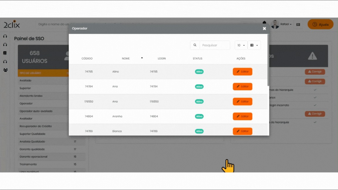 📌 Tipo de usuário : Ao selecionar um perfil específico, todos os usuários cadastrados nesse perfil serão exibidos, com a opção de edição. Para mais detalhes sobre a edição de cadastros, clique aqui.