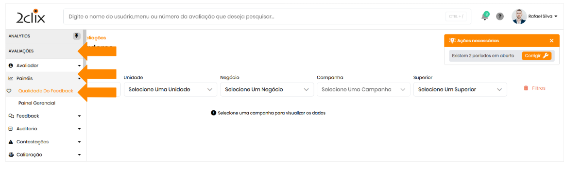 No menu lateral esquerdo, acesse: Avaliações > Painéis >Qualidade do Feedback.