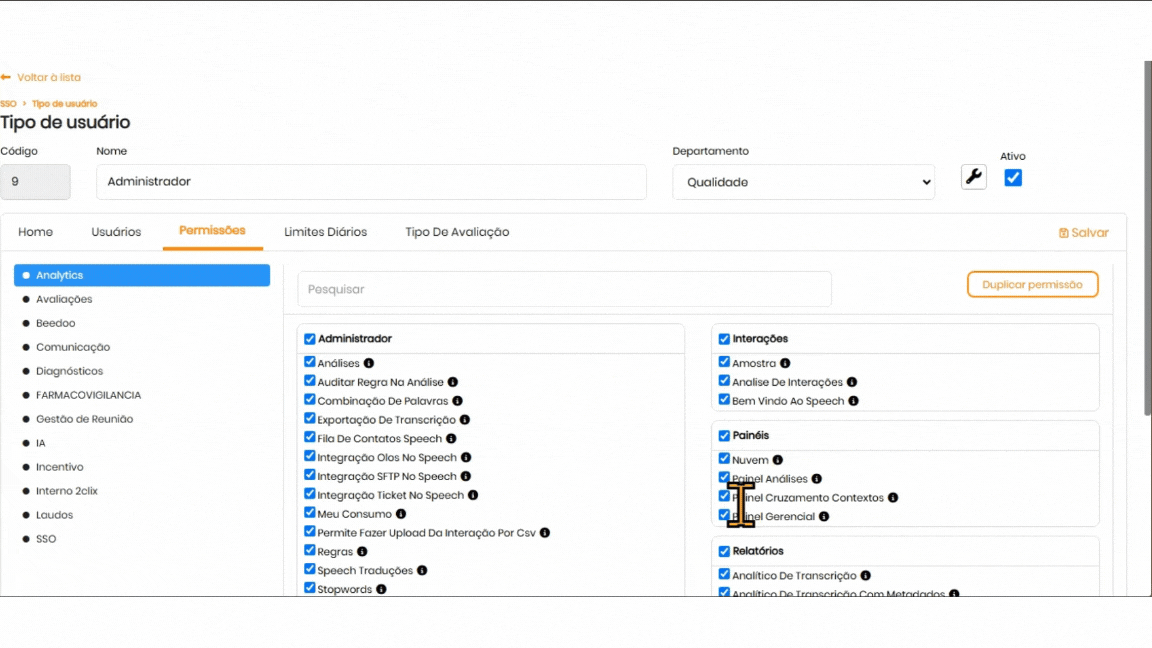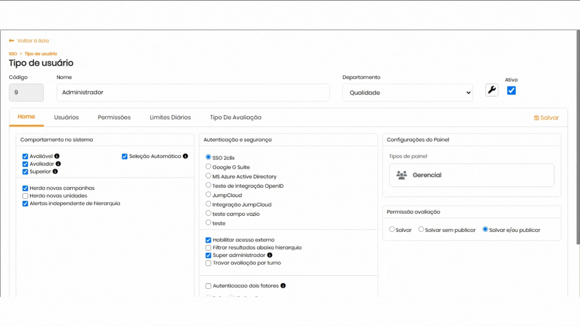 Na página de permissões, selecione o tipo de usuário que deseja configurar.
