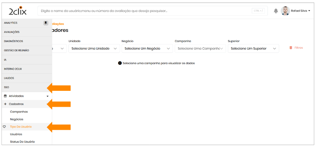 No menu lateral esquerdo acesse: SSO > Cadastro > Tipo de Usuários > Permissões de Acesso.