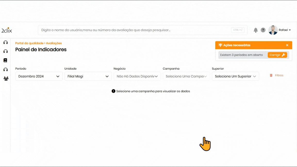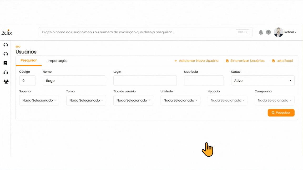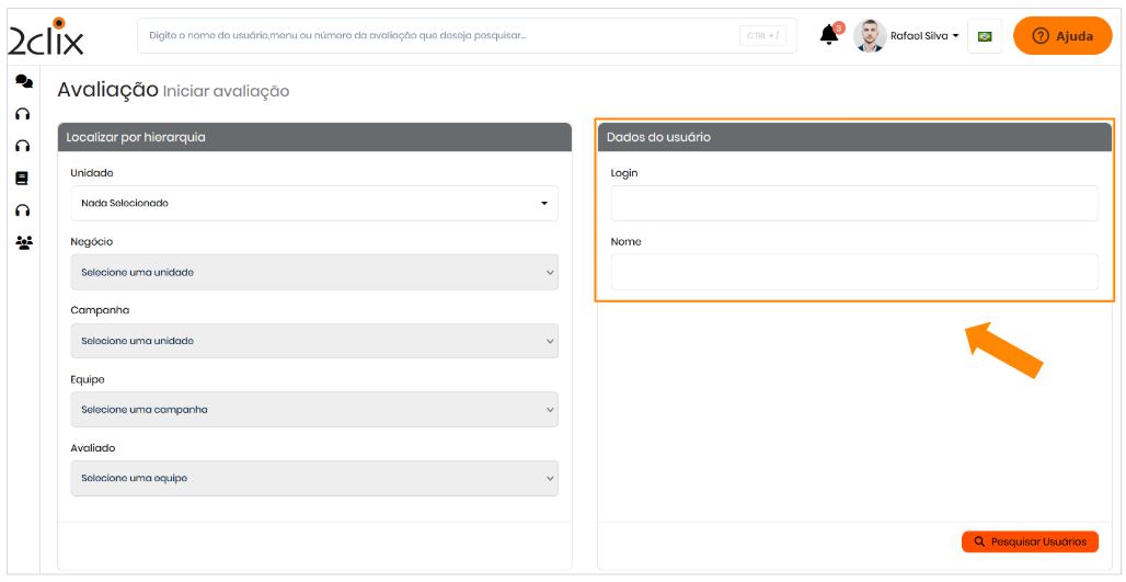 Para avaliar usuários com status diferente de "Ativo", utilize a busca em Dados do Usuário . Busque pelo nome ou login do usuário e, em seguida, inicie uma avaliação.