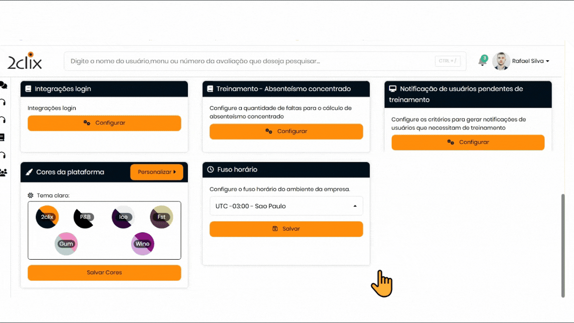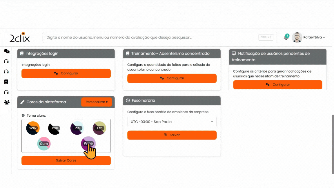 Personalize a plataforma para refletir a identidade visual da sua empresa, ajustando temas de menus, botões e outros elementos visuais. Essa funcionalidade é fácil de usar e permite criar um design alinhado à sua marca. Confira o passo a passo abaixo: