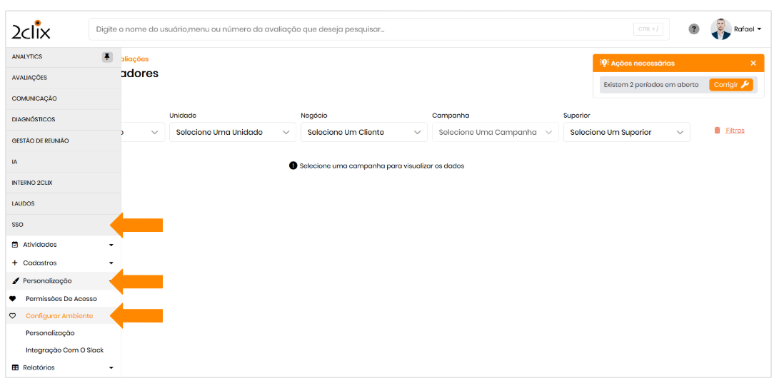 No menu lateral esquerdo, acesse: SSO > Personalização >Configurar Ambiente.