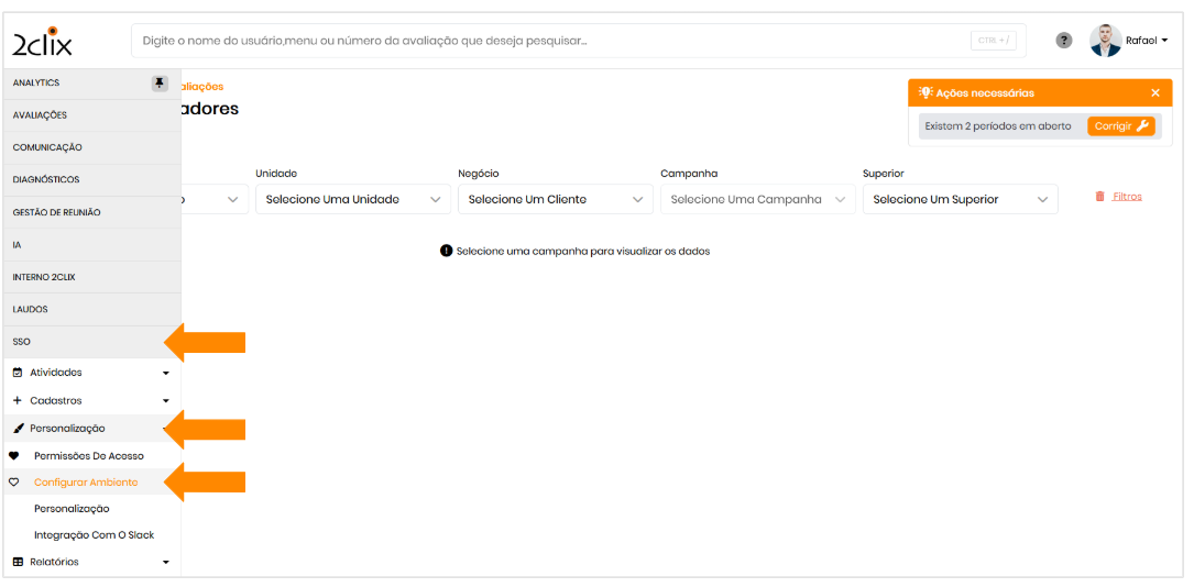 No menu lateral esquerdo, acesse: SSO > Personalização > Configurar Ambiente.